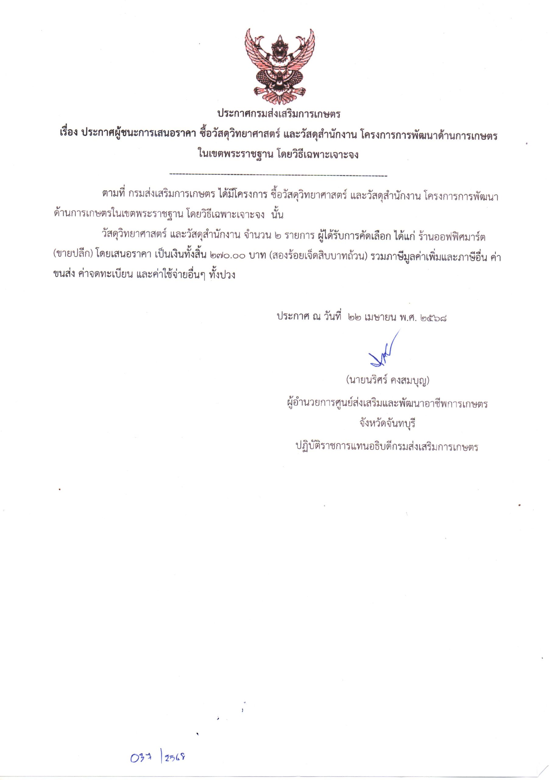 ซื้อวัสดุวิทยาศาสตร์และวัสดุสำนักงาน โครงการการพัฒนาด้านการเกษตรในเขตพระราชฐาน โดยวิธีเฉพาะเจาะจง เป็นเงิน 270.00 บาท Posted on 22 เมษายน 202529 เมษายน 2025 by adminPLA